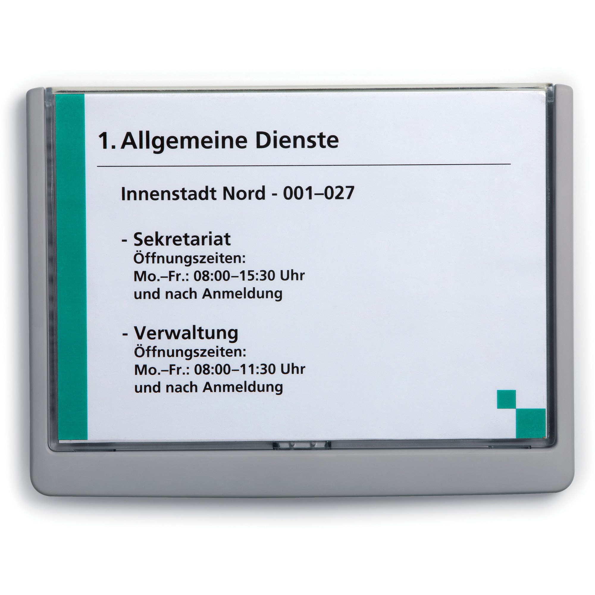 Plastic door sign with easy exchange of inserts through complete extraction of the viewing window. Suitable for large-scale applications such as in educational institutions, hospitals, restaurants, etc. Comes with assembly kit, drilling template and instructions.