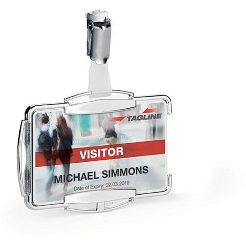 RFID ID card holder for 1 card. Provides protection at 13.56 MHz. Can be used in either portrait or landscape format. Rotating clip fastener. Combine with a chain, textile lanyard or badge reel.