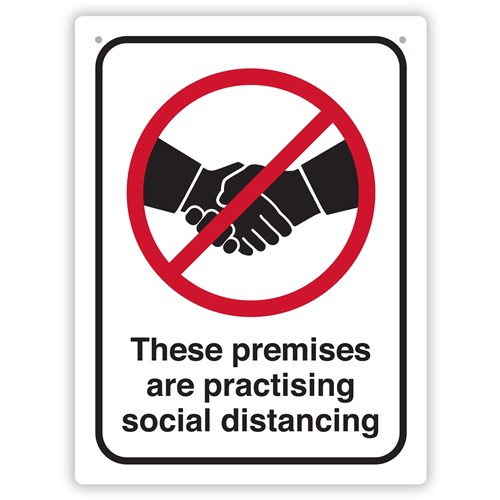 Size: 225W x 300mmH. Sign is white, black and red. Wording: These premises are practising social distancing. Manufactured from high-quality polypropylene for strength and durability. Ideal for communicating to customers, staff or any other group of people, that this premises is practising social distancing. Suitable to display both indoors or outdoors. The two holes at the top of each sign allow it to be attached to fences or walls using nails or screws. Light enough to be fixed using double sided tape or hook and loop adhesives. Made in Australia.