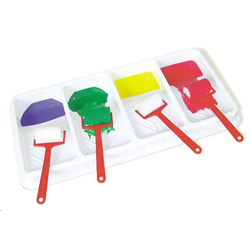 Roller tray with four separate bays for sponge rollers. Heavy duty pure white plastic (525mm x 235mm).
