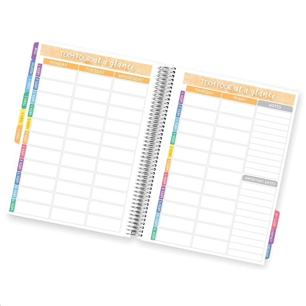 Description Designed in direct consultation with Australian teachers and featuring all the beautiful fresh, bright colours you expect from Elizabeth Richards we are very excited to introduce the 2021 Elizabeth Richards Teacher Diary! ** Please note this diary is undated ** You can find a 2021 Reference Calendar for help with dating here. Including everything a teacher might need, this diary is extraordinary value for money! A4 size, bound with a shiny, strong silver spiral coil, tabs for easy use and including our very popular customisable cover that allows you to insert any A4 cover you like, you will not find another diary with all these features at such a great price. Don't settle for any poor copies! Everything you need to be a super organised teacher! Includes two covers as standard (on a reversible insert) but you can easily insert any cover you like to customise your diarySchool terms/public holiday calendar for 2021Yearly plannerMonthly plannerDiary organised by Terms. Each Term has: Term at a glance, double pages for each week Monday - Sunday (11 weeks per term) and a double-page notes section after every week to contain all meeting notes relevant to that weekIn total there are 95 pages of note pages as we know you keep a lot of notes! Dedicated pages for: Events & volunteersProfessional development logStage BudgetStudent ContactsParent communication logPupil Checklist Also includes: Two internal pockets which are large enough to take an A4 sheet of paperThe back page of the diary is laminated so you can write notes or to-do lists and wipe them offDate dot stickers to use on the monthly plannerAttached silver elastic strap to mark your place in your diary and/or keep your diary closed and tidyColourful tabs separating all major sectionsSpecial tab protectors to make your tabs even stronger Click here to view a digital preview of our 2021 Teacher Diary. Tips: In the Month-at-a-glance section, you will note the placement circles for the date dots start on the correct day for the 1st of that month in 2021. However, we have provided more than the required days for each month to give you as much functional space as possible.Our tabs are sturdy and hard-wearing already, but as a bonus each diary also comes with enough adhesive plastic tab protectors you can apply to each tab - Making doubly sure the tabs are as hard-wearing as possible. View how to use our tab protectors here.Do you need more Parent Communication pages or notes pages? You can easily add extra pages to your diary by photocopying the sections you need and inserting them into your diary using our Page Snap-Ins -click here for more information. Click here to see more beautiful FREE downloadable covers you can insert easily into your Elizabeth Richards Diary. If you need another copy of our 2021 Public Holidays and Term Dates page that comes with every diary, please click here for a printable file.
