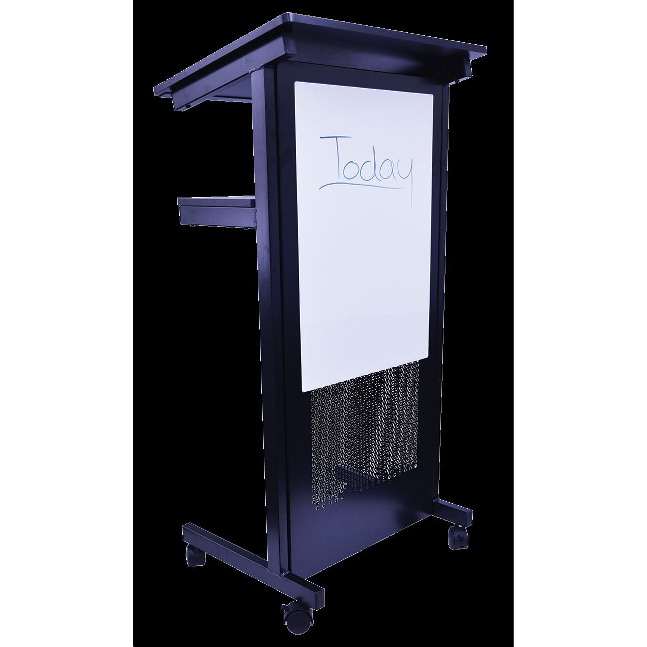 Description Our lectern is fully mobile with a sturdy angled surface for reading. Features an easy access shelf and maneuvers on strong lockable castors. Perfect for educational, training and corporate settings. Includes a handy removable and magnetic dry-erase sheet (60cm W x 42cm H) on the front of the lectern allowing the speaker to add whatever information they would like to highlight or use for interactive purposes. Lightweight but sturdy, our lectern is made from a strong steel tube frame finished in black powder coat with black laminated wood shelves. Backed by a 3-year warranty. Flat packed. Size: 117cm H x 59cm W x 43cm D Weight: 17kg *Please note this is a large furniture item and may incur a higher freight charge. If the freight charge differs from the band at the checkout we will contact you prior to dispatch. Please call us if you would like a quote.