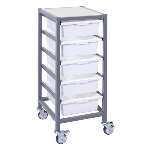 Description Please note: To make ordering even easier for you this listing includes Plastic Tote Trays, which are available in SEVEN different colour packs of our most popular colour combinations! Our Tote Tray Trolleys are perfect for organising and storing your valuable resources and having them readily available for your students. Features: Designed to withstand the rigours of classroom use and give many years of colourful organisationStrong powder-coated steel constructionHeavy-duty lockable castors andReversible wooden top. (Simply pop out of frame and flip over to change your top colour.) Reversible top : White/Woodgrain Size: Size of trolley: 38cm W x 44cm D x 92cm H Includes 5 Plastic Tote Trays. Make your selection from the SEVEN colour sets available. Tote Tray Set choices available in this listing: 5 x Black Plastic Tote Trays5 x Clear Plastic Tote Trays5 x Light Blue Plastic Tote Trays5 x White Plastic Tote TraysMixed Colour Tote Tray Set 1: Light Blue, Green, Yellow, Orange, RedMixed Colour Tote Tray Set 2: White, Lime Green, Green, Light Blue, BlueMixed Colour Tote Tray Set 3: Light Blue, Magenta, Lime Green, Orange, Yellow Tote Tray Trolleys are also available in double and triple columns. Assembly instructions are available for download here. *Please note this is a large furniture item and may incur a higher freight charge. If the freight charge differs from the band at the checkout we will contact you prior to dispatch. Please call us if you would like a quote.