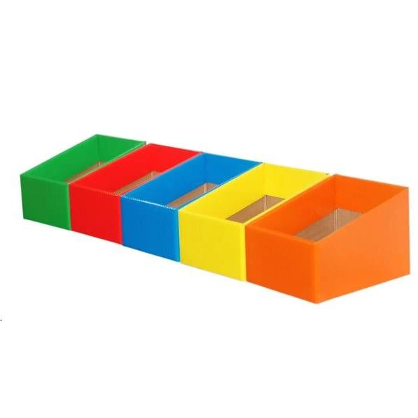 Description Match PM Reading Programs.Designed to display books with the spine facing forward. Perfect for more advanced readers to help them quickly find the next book in the series.Laminated boxes are superior in strength, durability and brighter in colour! Sold in packs of 5 in single colours or in mix colour packs. Mix Pack 1 (set of 5) - 1 each Red, Light Blue, Yellow, Green & Purple Mix Pack 2 (set of 5) - 1 each Red, Light Blue, Yellow, Green & Orange Mix Pack 3 (set of 5) - 1 each Purple, Magenta, Orange, Blue & Yellow Mix Pack 4 (set of 5) - 1 each Light Blue, Yellow, Green, Magenta & Orange 16.5cm wide x 22cm deep x 15.5cm high (back) x 10cm high (front).