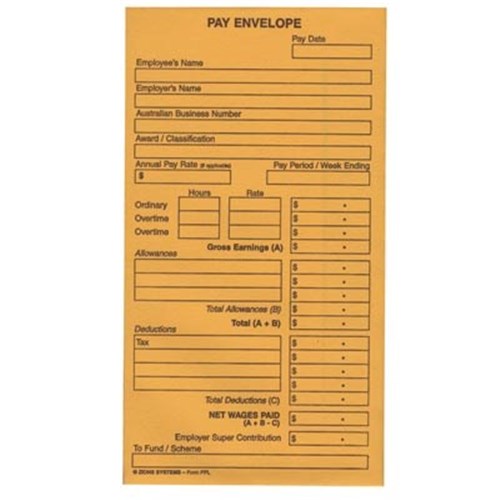 Top loading allows all note denominations to be inserted into the envelope flat. Made from gold kraft and features self-seal flap. Employee details can be written in the allocated sections on the envelope. Designed to comply with Federal and State Award, Industrial Relations Regulations recording requirements.