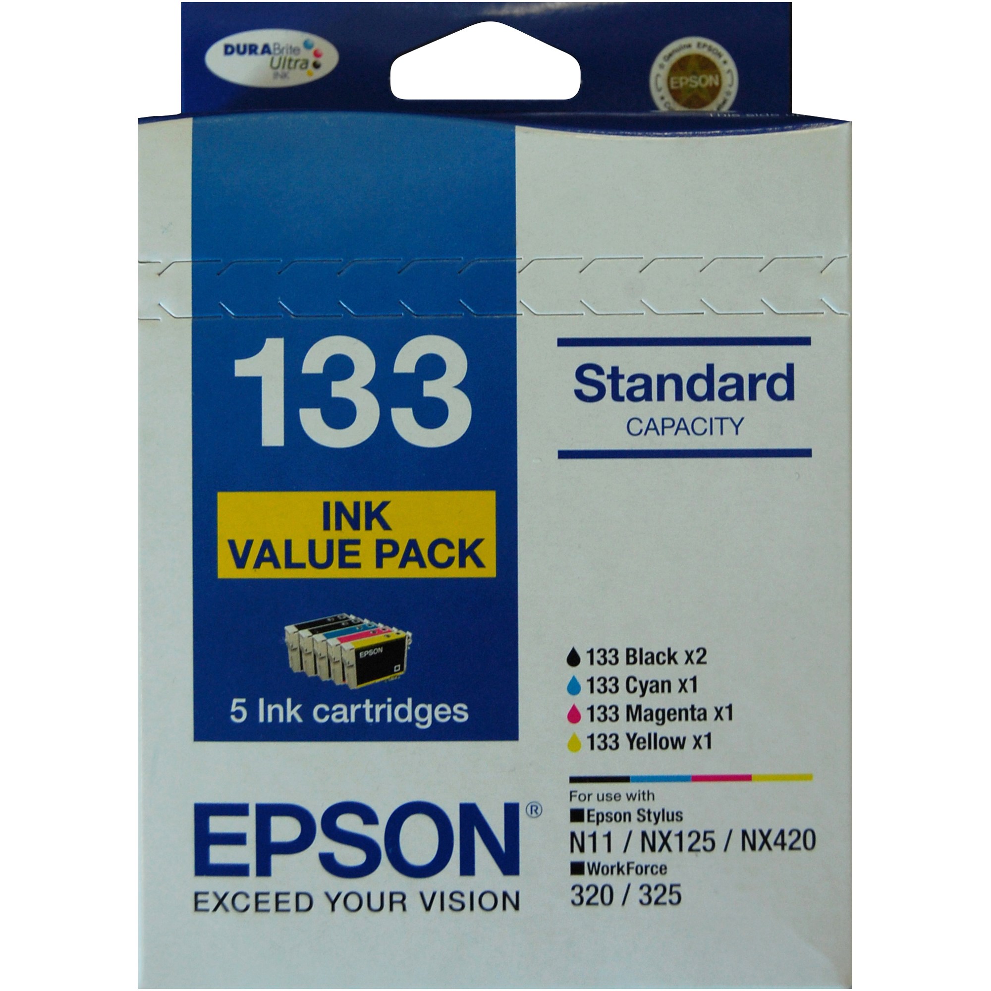 Compatible with Epson machines: Stylus N11, NX125, NX130, NX230, NX430, NX420, Workforce 320, 325, 435, 525. It has an estimated page yield of 300 pages. The ultimate dye ink designed especially for photo printing. Printed on Epson?s range of photo papers, it delivers excellent high definition, colour reproduction, and glossiness, with a durability superior to that of silver halide or lab photos. This pack contains: 5 x 133 Standard Capacity DURABrite Ultra Individual ink cartridges (2 x Black, Cyan, Magenta, Yellow).