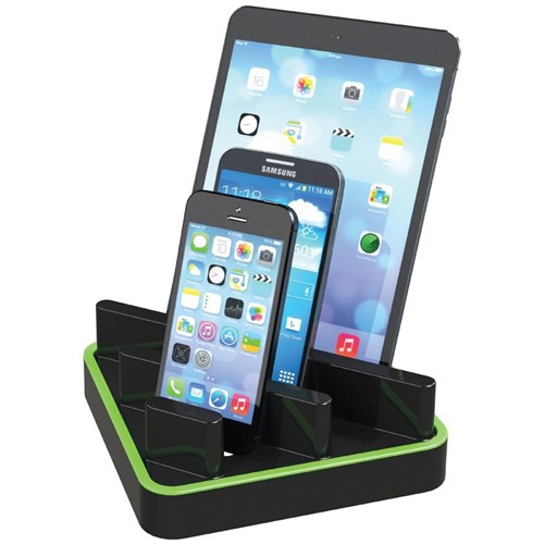 Reduces clutter by vertically organising up to 4 smart devices. Cable management system allows you to plug your own cable into your device to charge/sync. Maximum device/case thickness : 25mm. Dimensions: W160xL160xH60mm.