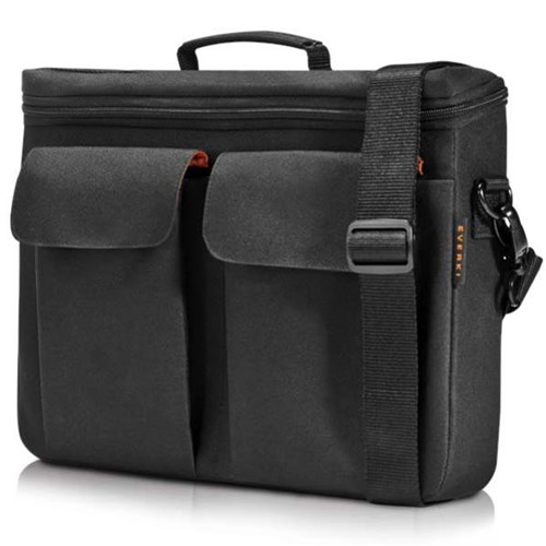 360mm x 270mm x 70mm. Fits netbooks/laptops up to 13.3 to 14 Inches. Includes a shoulder strap. Two front accessory stash pockets. Leather name tag pocket. Padded foam inner to protect from bumps with easy access slots. Hard EVA shell to protect your device. Metal zippers for enhanced durability. High contrast orange lining to find accessories easier. Backed by Everki Limited Lifetime Warranty.