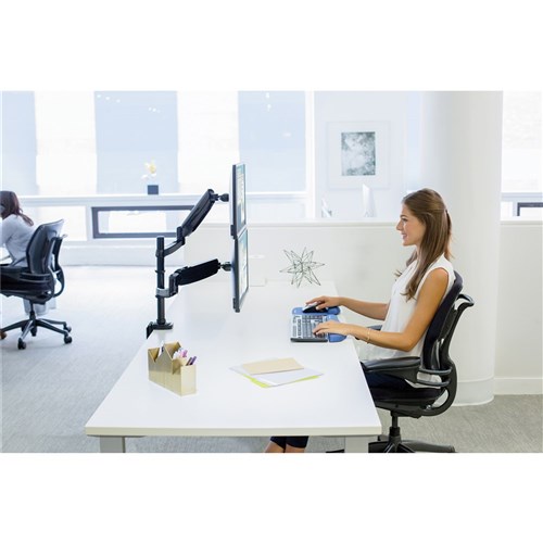 Fully independent adjustable monitor arms, with 360 degrees rotation via innovative gas spring technology allowing for effortless movement. Easily mounted via clamp or grommet, each arm holds a monitor up to 10kg (up to 27 inch monitors) and meets VESA mounting standards. Maximum width (from the centres of each monitor mount): 850.9mm. Maximum reach depth (from base towards the user): 495.3mm. Two built-in USB ports located at the base of the product makes it easy to connect your favourite devices. Intuitive cable management system helps minimise clutter. VESA 75 x 75 and 100 x 100 compliant. Specifications: +85 degrees / -15 degrees tilt, 180 degrees pan, 360 degrees rotation. 5 Year Manufacturer's Warranty.