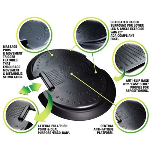 Unique anti-fatigue system range that provides the ultimate combination of standing comfort and body support. Reduces pressure on the body by up to 54%. Integrated passage pods for added relaxation of foot muscles. Designed to reduce the strain on feet, legs knees and back joints through prolonged standing. Polyurethane construction guaranteed not to lose body support over time. Ergonomically designed print style to encourage continual foot movement. Built-In anti-microbial active ingredient will not wear away or wash off. Contoured curl-proof edging to ensure mat will remain totally flat. 10 Year Manufacturer's Warranty.