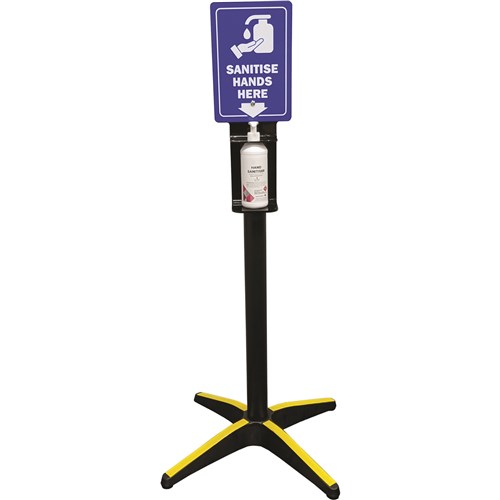 Adjustable to suit various bottle sizes Sturdy base with levelling feet for uneven surfaces Sanitise Hands Here and reflective stickers included Supplied unassembled Suitable for indoor & outdoor use Dispenser Unit: Heavy duty black acrylic construction Base: Cast aluminium 4 star base with a black powder coat finish Hand sanitiser and/or pump bottle are not included Unit Dimensions 1320x450x450mm