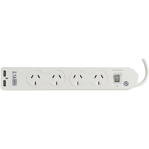 Powerboard with master switch with surge and overload protection. Includes 2 x USB outlets for charging and powering your USB devices without a PC. Features handy right angle plug. 1m power cord and the strip design can fit neatly behind furniture & office equipment. Input Voltage Rating: 240V a.c 50Hz. Current: 10A mains outlet. USB outlets 1A Max. 5.0V.