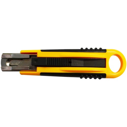 Self-Retractable Cutting Knives are popular safety tools used to prevent injury Spring loaded blade automatically retract once pressure is released on the slide button Rubber grip for maximum feel and comfort Blade is only exposed when the knife is in use