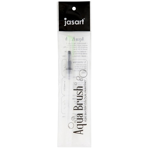 The Jasart Aqua Brush is a refillable multipurpose brush Fill with water to blend or with inks to create water colour effects Removable cap prevents excess water leakage and protects the brush when not in use Click close pen lid ensures an air tight closure Pocket clip on lid Hexagon handle for easy grip, also avoids the pen rolling away when not in use Clear barrel will show true colour if ink added Soft white synthetic bristles Available in Round Fine, Medium and Thick nibs and Flat Medium