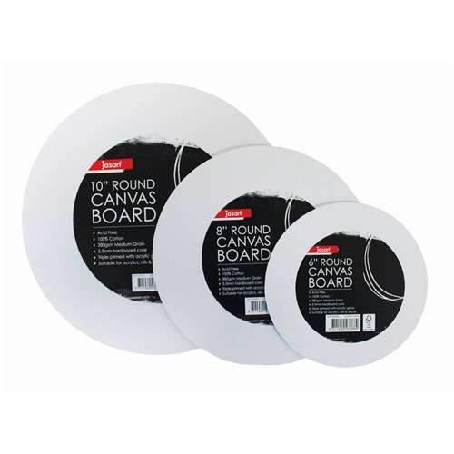 Jasart Round Canvas Boards are primed canvas die cut on a firm 3.5mm hardboard core base with backing paper 100% cotton, 380gsm canvas provides a medium grain surface to work on Triple primed with acrylic gesso makes these boards ideal for use with acrylic, oil & alkyds Ideal for beginners and students Acid Free, FSC Certified 5 sizes available, from 6 inch to 16 inch