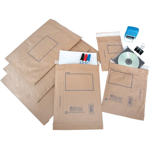 Rugged, all purpose, paper-fibre cushioned mailers. Constructed from heavy duty kraft paper with a uniform, 100% recycled inner batting (ground-up paper and newsprint) that provides excellent protection. Self-seal closure and easy opening tear-tape. Double fold corners and glued bottom flap. Excellent edge and corner protection. Smooth inner liner allows for easy product insertion.
