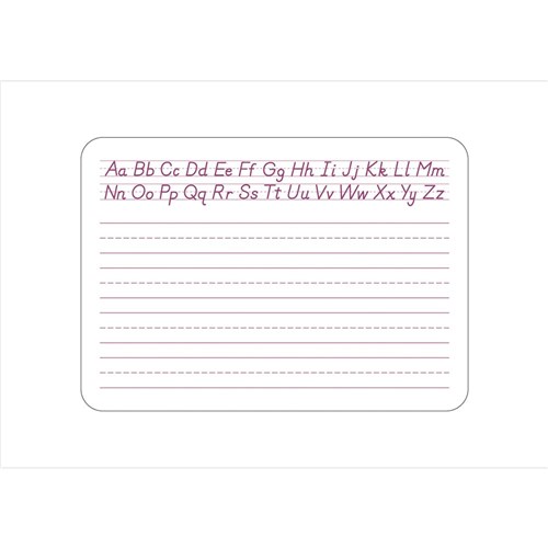 Features all letters in the alphabet in capitals and lower case. Supplied with whiteboard marker and eraser. Pre-printed ruled guides to assist in the development of hand writing skills. Reverse side can be utilised as a plain whiteboard.