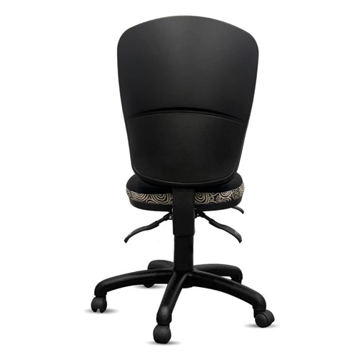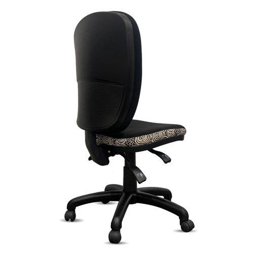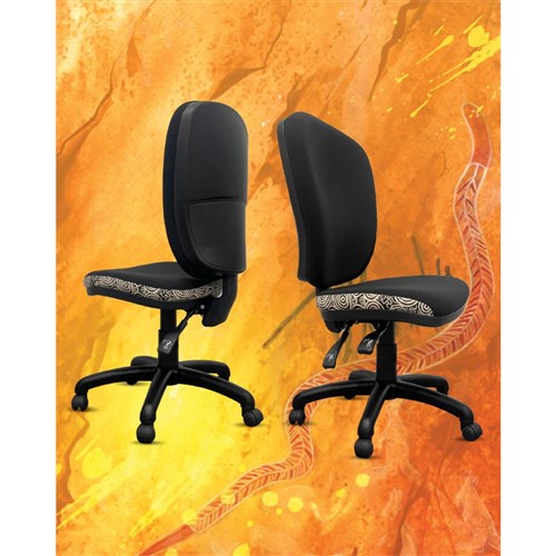A unique commercial fabrics designed by Nelly Patterson (Indigenous Artist) combined with K2 Black Fabric to upholster the chair. Weight rating: AFRDI Rated Load 160kg Approved. Indicated seat hours: 24/7. Seat Dimensions: 510W x 490D x 460-590mmH. Back Height: 560mmW. Back Width: 480mm. Heavy duty commercial chair with 3 lever mechanism and ratchet back height adjustment. 5 way 700mm commercial grade nylon base. Heavy duty gas lift cylinder. Moulded seat foam for supreme comfort. Fire retardant contoured moulded foam. Product image for reference only. Design pattern may differ as a result of variations in the art work. 10 Year Years Manufacturer's Warranty. Delivery, installation and assembly charges may apply to furniture. Please enquire to confirm. Optional adjustable armrest available. Refer to product code 3043352.