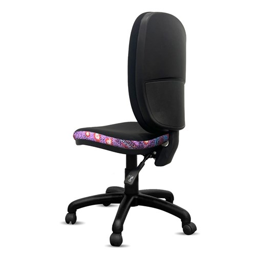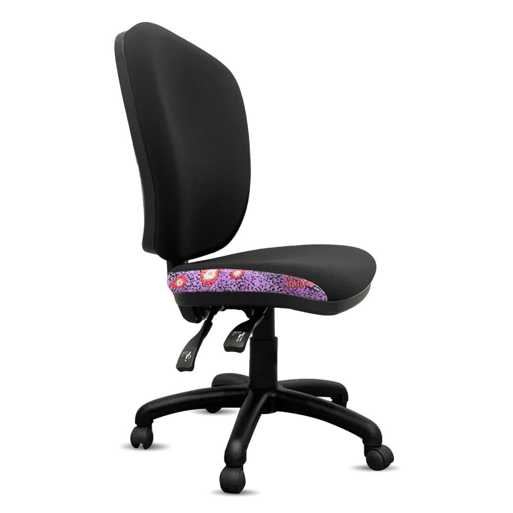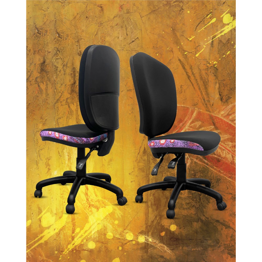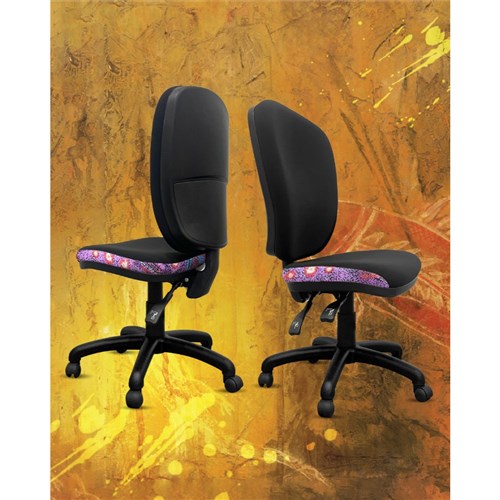 A unique commercial fabrics designed by Andrea Adamson (Indigenous Artist) combined with K2 Black Fabric to upholster the chair. Weight rating: AFRDI Rated Load 160kg Approved. Indicated seat hours: 24/7. Seat Dimensions: 510W x 490D x 460-590mmH. Back Height: 560mm. Back Width: 480mm. Heavy duty commercial chair with 3 lever mechanism and ratchet back height adjustment. 5 way 700mm commercial grade nylon base. Heavy duty gas lift cylinder. Moulded seat foam for supreme comfort. Fire retardant contoured moulded foam. Product image for reference only. Design pattern may differ as a result of variations in the art work. 10 Year Manufacturer's Warranty. Delivery, installation and assembly charges may apply to furniture. Please enquire to confirm. Optional adjustable armrest available. Refer to product code 3043352.