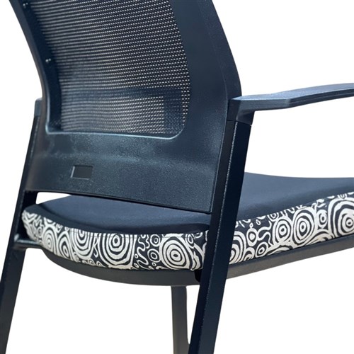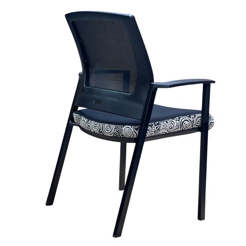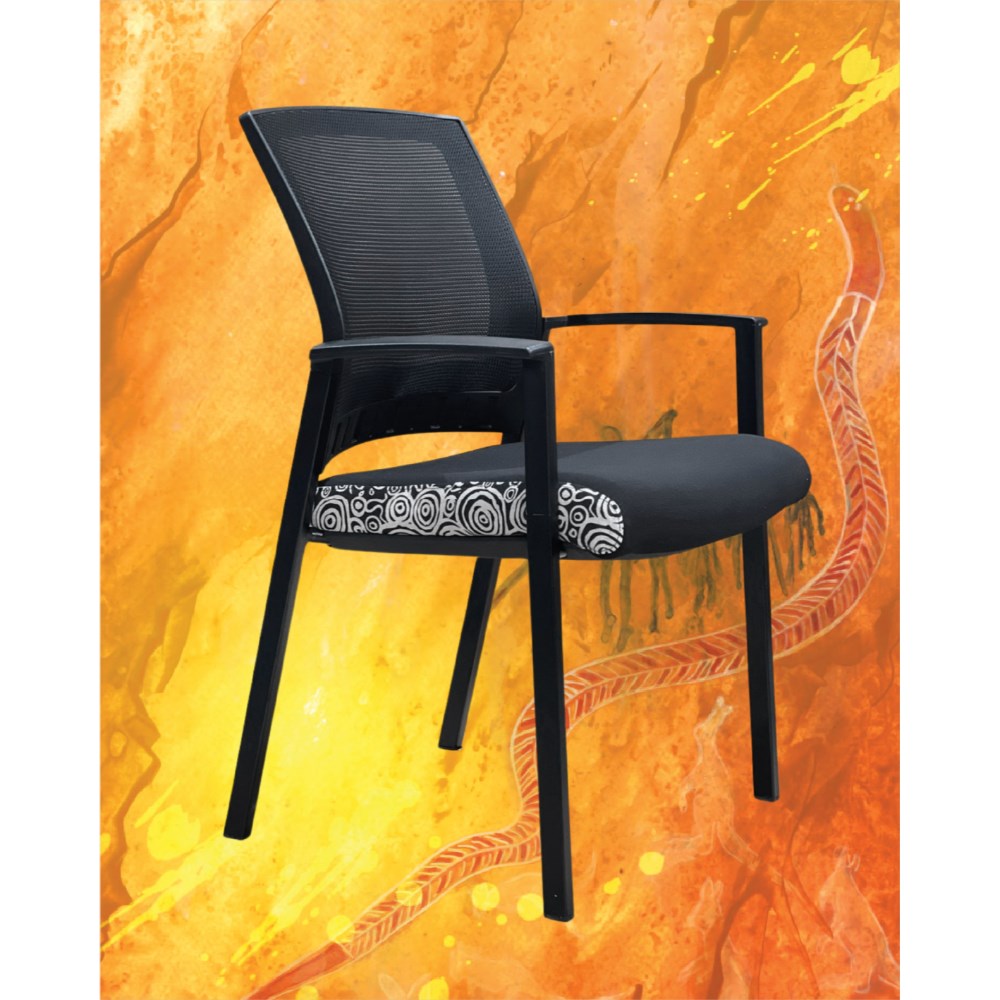 A unique commercial fabrics designed by Nelly Patterson (Indigenous Artist) combined with K2 Black Fabric to upholster the chair. Weight rating: 135kg. Indicated seat hours: 12 hours. Seat Dimensions: 505W x 450D x 490mmH. Back Height: 460mm. Back Width: 440mm. Heavy duty commercial chair with 3 lever mechanism and ratchet back height adjustment. Excellent posture correct lumbar. Solid, flat PU arms. Sleek design for comfort. Chairs stack 4 high. Product image for reference only. Design pattern may differ as a result of variations in the art work. 7 Year Years Manufacturer's Warranty. Delivery, installation and assembly charges may apply to furniture. Please enquire to confirm.