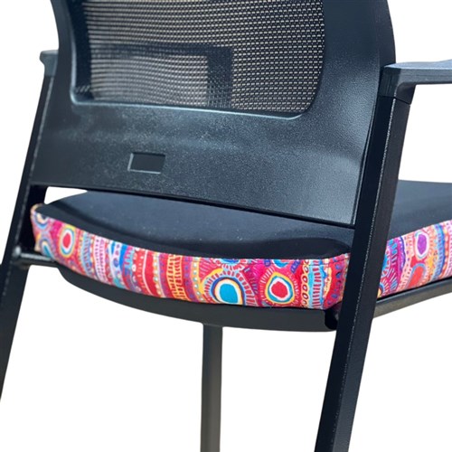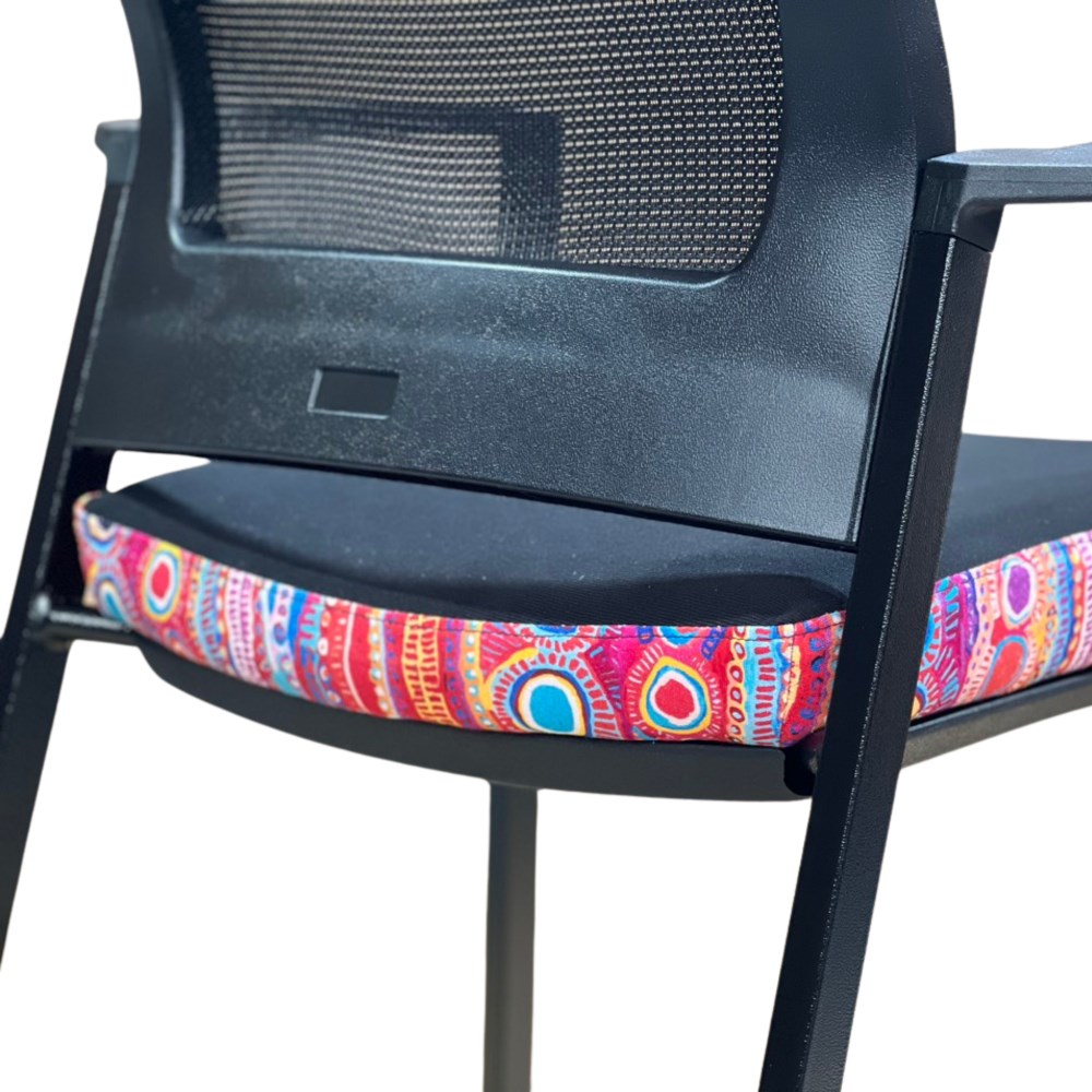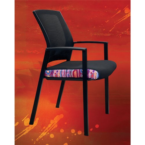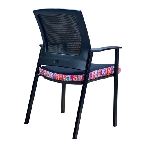 A unique commercial fabrics designed by Murdie Nampijinpa Morris (Indigenous Artist) combined with K2 Black Fabric to upholster the chair. Weight rating: 135kg. Indicated seat hours: 12 hours. Seat Dimensions: 505W x 450D x 490mmH. Back Height: 460mm. Back Width: 440mm. Heavy duty commercial chair with 3 lever mechanism and ratchet back height adjustment. Excellent posture correct lumbar. Solid, flat PU arms. Sleek design for comfort. Chairs stack 4 high. Product image for reference only. Design pattern may differ as a result of variations in the art work. 7 Year Years Manufacturer's Warranty. Delivery, installation and assembly charges may apply to furniture. Please enquire to confirm.