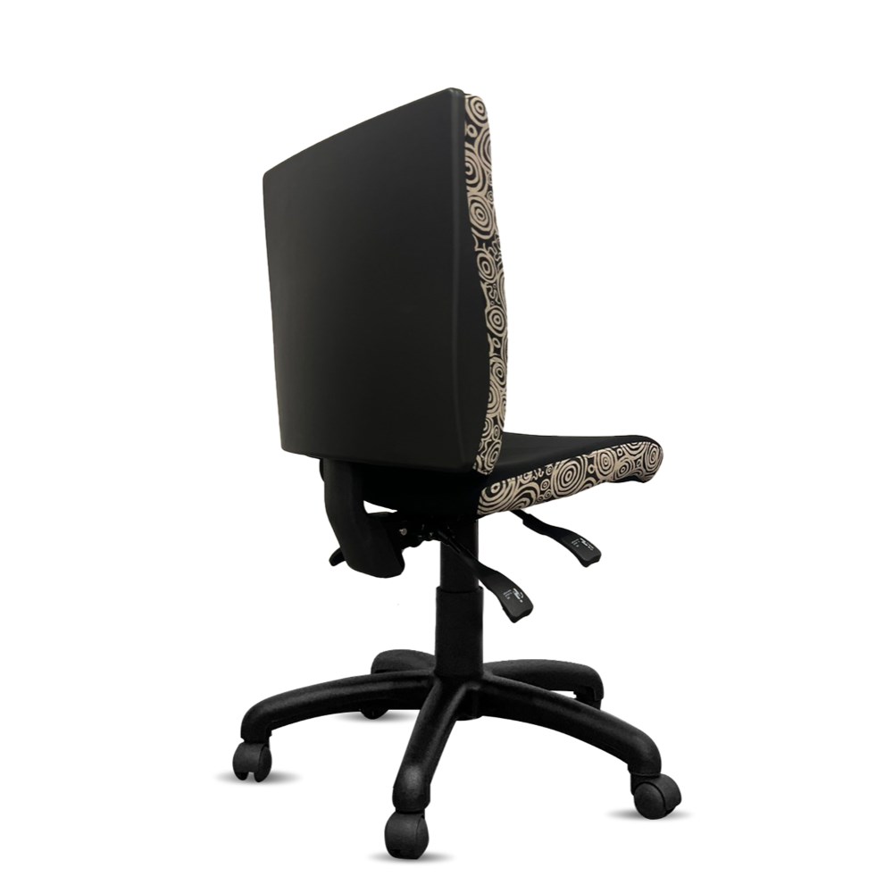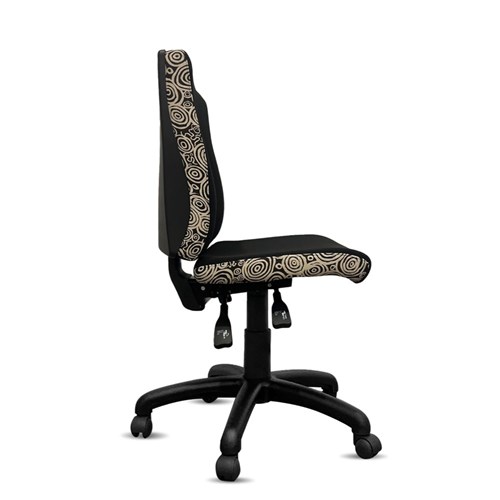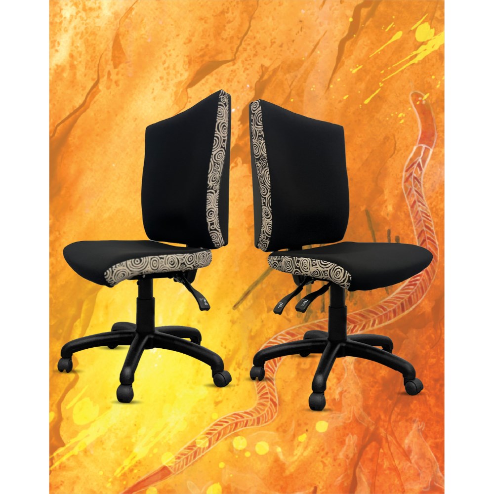 A unique commercial fabrics designed by Nelly Patterson (Indigenous Artist) combined with K2 Black Fabric to upholster the chair. Weight rating: 135kg. Indicated seat hours: 24/7. Seat Dimensions: 510W x 450D x 460-590mmH. Back Height: 500mmW. Back Width:495mm. Heavy duty commercial chair with 3 lever mechanism and ratchet back height adjustment. 5 way 700mm commercial grade nylon base. Heavy duty gas lift cylinder. Moulded seat foam for supreme comfort. Fire retardant contoured moulded foam. Product image for reference only. Design pattern may differ as a result of variations in the art work. 7 Year Years Manufacturer's Warranty. Delivery, installation and assembly charges may apply to furniture. Please enquire to confirm. Optional adjustable armrest available. Refer to product code 3043352.