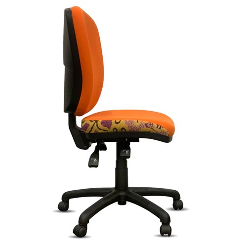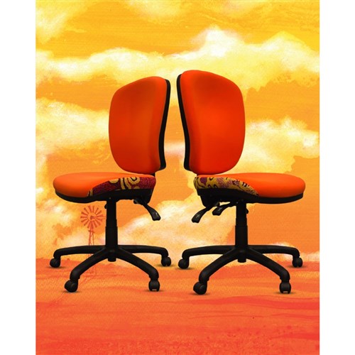 A unique commercial fabrics designed by Paddy Stewart (Indigenous artist) combined with K2 Golden Orange Fabric to upholster the chair. Weight rating: AFRDI Rated Load 160kg Approved. Indicated seat hours: 24/7. Seat Dimensions: 510W x 490D x 460-590mmH. Back Height: 560mm. Back Width: 480mm. Heavy duty commercial chair with 3 lever mechanism and ratchet back height adjustment. 5 way 700mm commercial grade nylon base. Heavy duty gas lift cylinder. Moulded seat foam for supreme comfort. Fire retardant contoured moulded foam. Product image for reference only. Design pattern may differ as a result of variations in the art work. 10 Year Manufacturer's Warranty. Delivery, installation and assembly charges may apply to furniture. Please enquire to confirm. Optional adjustable armrest available. Refer to product code 3043352.