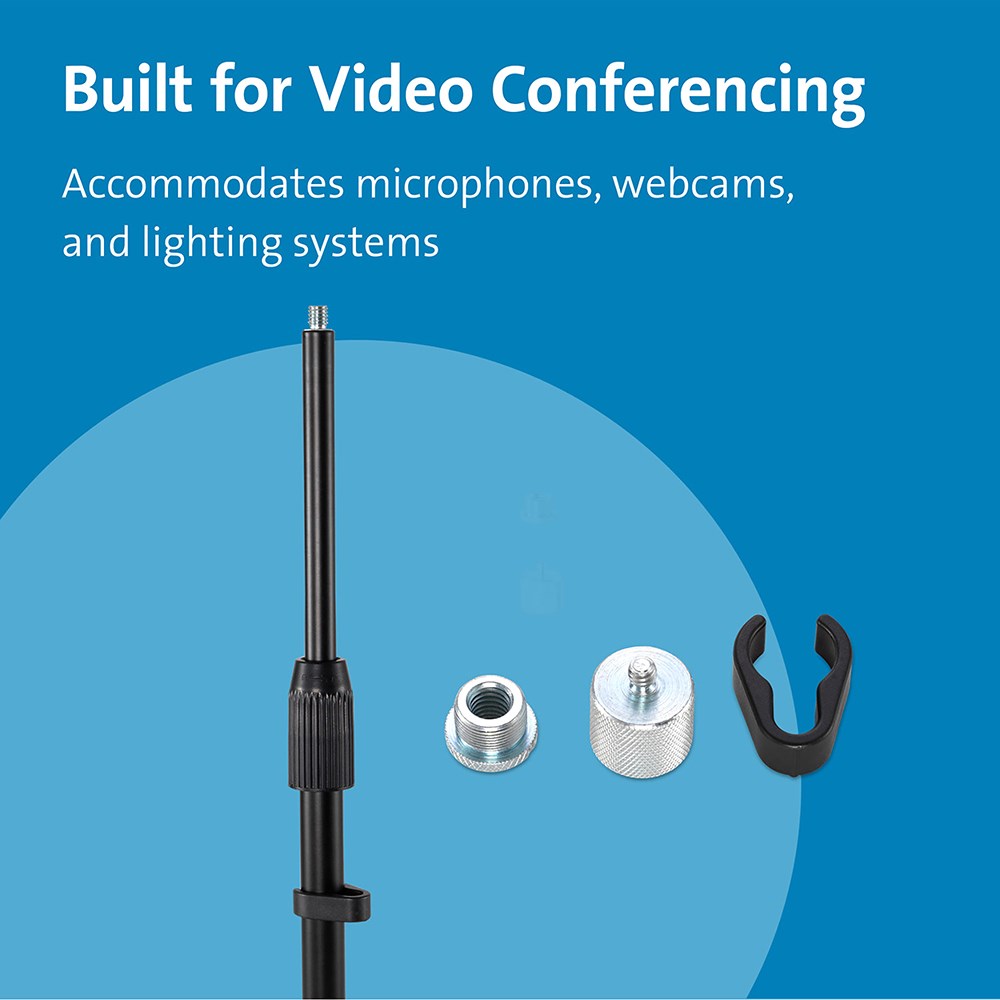 An adaptable mounting solution for microphones, webcams, and lights - includes 3/8 inch, 1/4 inch and 5/8 inch adaptors. Extends from 300mm to 482mm to accommodate different webcam, microphone and lighting configurations. Keeps cords organised and out of your workspace allowing for a clean & tidy video conferencing setup. A wide, non-skid base keeps your stand and accessories stable during use. 2 Year Manufacturer's Warranty.