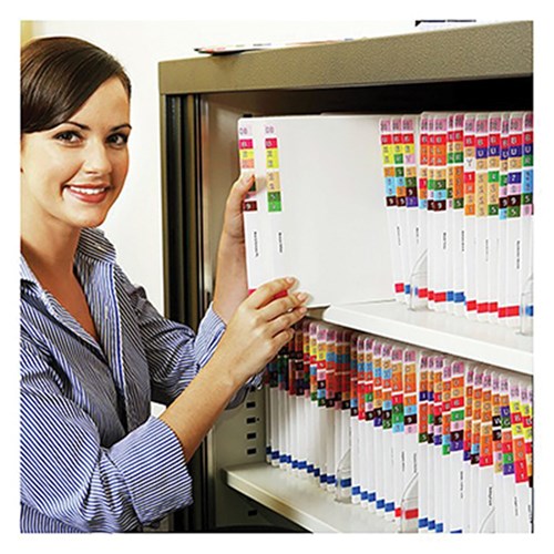 Apply on the side of your files. Each alpha from 'A'-'Z' including 'Mc' is given a different colour for easy identification. Colour coding makes it easier to find files and eliminate misfiling.
