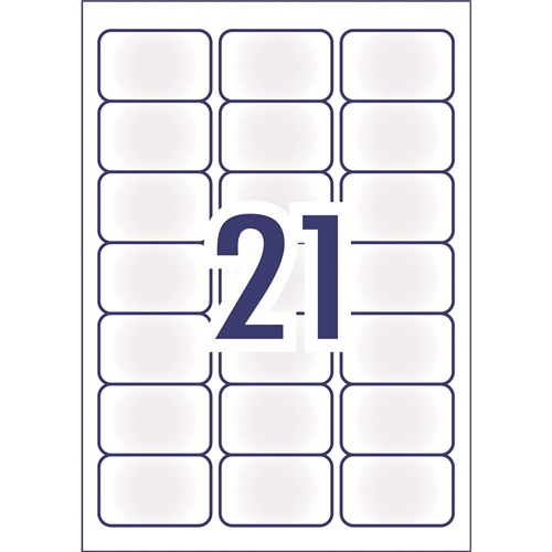 Ideal for parcels or boxes with a dark surface. Compatible with Inkjet printers and smudge-free for a professional finish. Labels provide a contemporary frosted clear finish. Made in Australia. Size: 63.5x38.1mm 525 labels, 25 sheets. 21 labels per sheet (21UP).