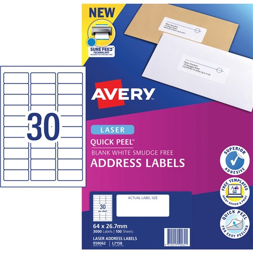 Avery Quick Peel Address Laser White L7158 64x26.7mm 30UP 3000 Labels 100 Sheets