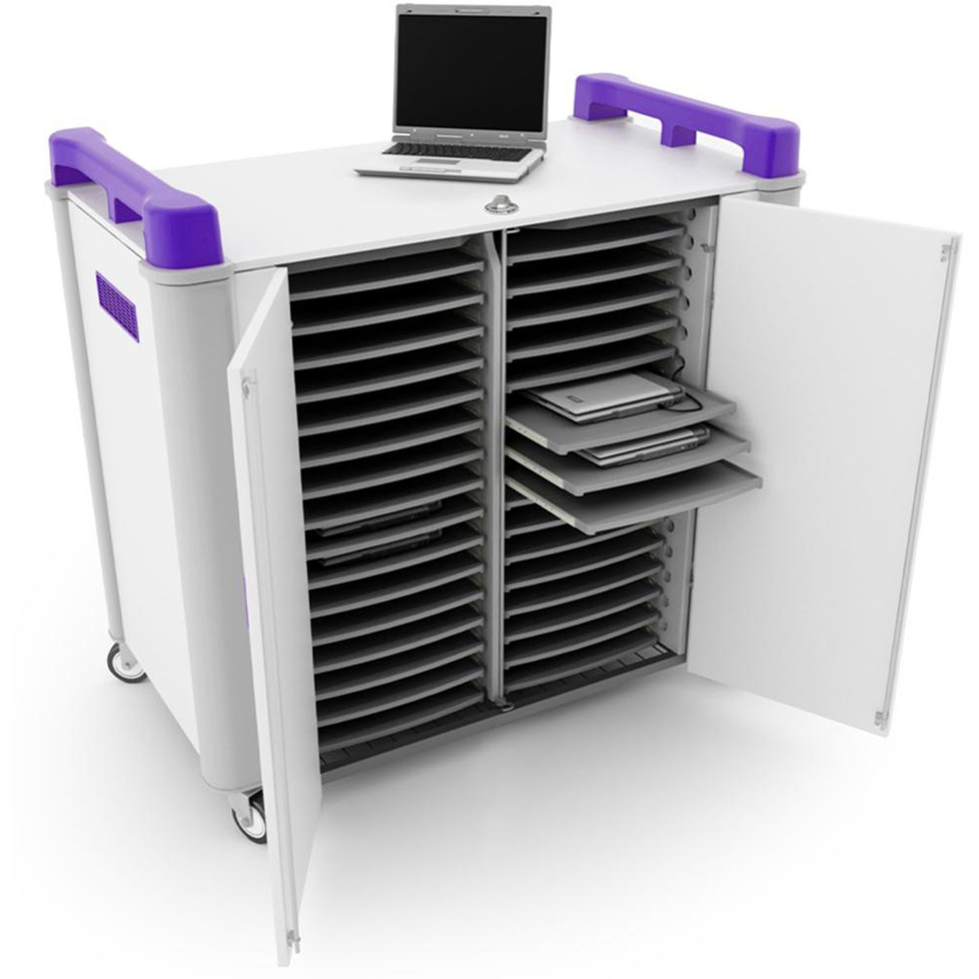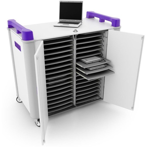 Charges 32 devices up to 19 Inch screen size Device adaptors plug into 4 x 8-way power strips designed and manufactured in-house Sockets accommodate larger adaptors and plugs without blocking adjacent outlets Perfectly designed cable clips secure charging cables to dividing bars to ensure cables is locked in place next to device Fitted with large all directional swivel, non-marking hospital grade rubber wheels (2 braked) Rounded corners fitted with rubber corner bumpers and extrusions for shock absorption to prevent damage to walls and devices inside Concealed lever unlocks rear power compartment to enable clear access to cables and AC adaptors when required Built-in heat sensor will shut off power if a device overheats or if interior temperature reaches 32C/90F degrees to prevent risk of fire or damage to devices Dual point locking system, with keys provided, to secure at the top and bottom of both device and power compartment to prevent theft, damage or tampering Lifetime Warranty (5 years Electrical)