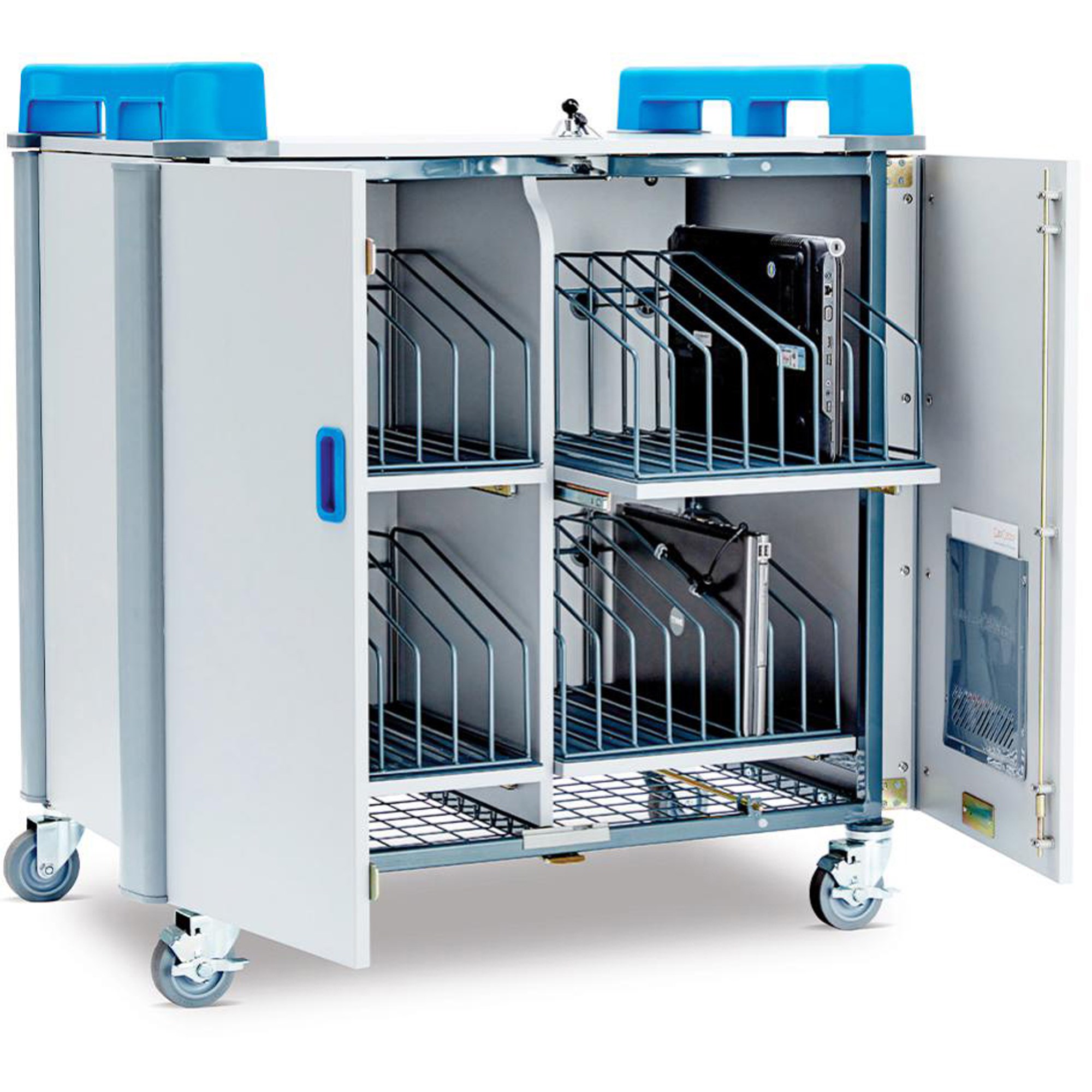Charges 32 devices up to 17 Inch screen size. Device adaptors plug into 4 x 8-way power strips designed and manufactured in-house. Sockets accommodate larger adaptors and plugs without blocking adjacent outlets. Perfectly designed cable clips secure charging cables to dividing bars to ensure cables is locked in place next to device. Fitted with large all directional swivel, non-marking hospital grade rubber wheels (2 braked). Rounded corners fitted with rubber corner bumpers and extrusions for shock absorption to prevent damage to walls and devices inside. Concealed lever unlocks rear power compartment to enable clear access to cables and AC adaptors when required. Built-in heat sensor will shut off power if a device overheats or if interior temperature reaches 32C/90F degrees to prevent risk of fire or damage to devices. Dual point locking system, with keys provided, to secure at the top and bottom of both device and power compartment to prevent theft, damage or tampering. Lifetime Warranty (5 years Electrical).