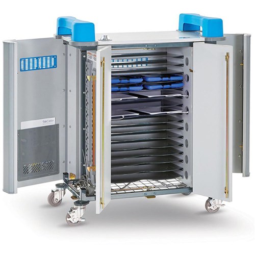 Charges 32 tablets up to 12 Inch screen size. Device adaptors plug into 4 x 8-way power strips designed and manufactured in-house. Sockets accommodate larger adaptors and plugs without blocking adjacent outlets. Cables feed from side power compartment to front device compartment via cable clip portholes, preventing cables being removed from the device compartment. Fitted with large all directional swivel, non-marking hospital grade rubber wheels (2 braked). Thick steel binding plate connects heavy duty wheels to the cart ensuring wheels never buckle or loosen. Built-in heat sensor will shut off power if a device overheats or if interior temperature reaches 32C/90F degrees to prevent risk of fire or damage to devices. Silent ventilation system includes side and rear vents plus a uniquely designed weld mesh base to keep devices cool with constant air circulation without the need for a noisy fan that can spread germs. Power7 Management system preset for 3 daily charging schedules on weekdays with no charging schedules set for weekends, instructions supplied to amend charging schedule easily. Lifetime Warranty (5 years Electrical).