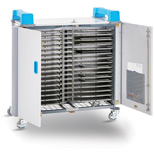 Charges 32 devices up to 14 Inch screen size. Device adaptors plug into 4 x 8-way power strips designed and manufactured in-house. Sockets accommodate larger adaptors and plugs without blocking adjacent outlets. Specially designed device shelf includes cleverly integrated cable channel and 5 flush mounted cable clips to ensure cables stay in place and free from damage. Fitted with large all directional swivel, non-marking hospital grade rubber wheels (2 braked). Thick steel binding plate connects heavy duty wheels to the cart ensuring wheels never buckle or loosen. Built-in heat sensor will shut off power if a device overheats or if interior temperature reaches 32C/90F degrees to prevent risk of fire or damage to devices. Silent ventilation system includes side and rear vents plus a uniquely designed weld mesh base to keep devices cool with constant air circulation without the need for a noisy fan that can spread germs. Power7 Management system preset for 3 daily charging schedules on weekdays with no charging schedules set for weekends, instructions supplied to amend charging schedule easily. Lifetime Warranty (5 years Electrical).