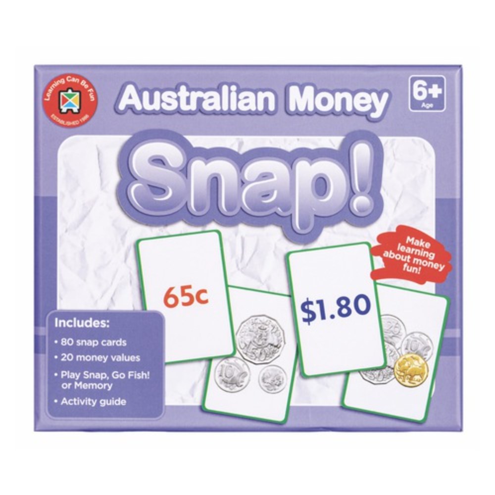Features 20 different values represented as both numerals and coin illustrations. Young learners can practise financial literacy while learning to recognise Australian currency. Includes: 80 snap cards, 20 money values and activity guide. Play Snap, Go Fish! or Memory