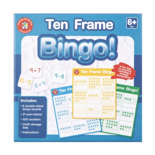 A valuable resource to encourage learning through play. This easy-to-play game will help teach children to count, add and subtract by thinking about numbers in frames of 10. A ten frame is a grid divided into two rows of five boxes, with each box representing one unit. Seeing numbers represented in different ways on the ten frame prompts children to form mental images of numbers. Early learners will quickly learn basic sums and number recognition while having fun. Includes: 6 double-sided bingo boards, 21 sum tokens, 100 counters, cloth storage bag and instructions.