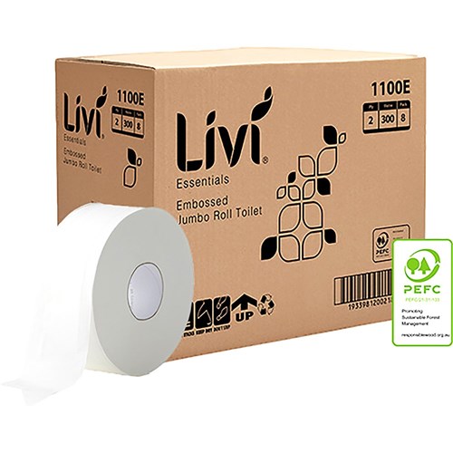 A quality soft and strong 2 ply toilet paper with a emboss for added comfort and appeal. Jumbo toilet rolls are suitable for high traffic bathrooms, minimising run out and refilling. 100% sustainable virgin fibre that is independently certified annually by PEFC. To suit Livi toilet dispenser 5504, 5505 and 5511.