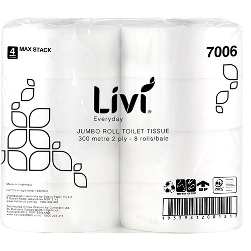 Livi Everyday Toilet Paper Jumbo Roll 2 Ply 300m Pack Of 8