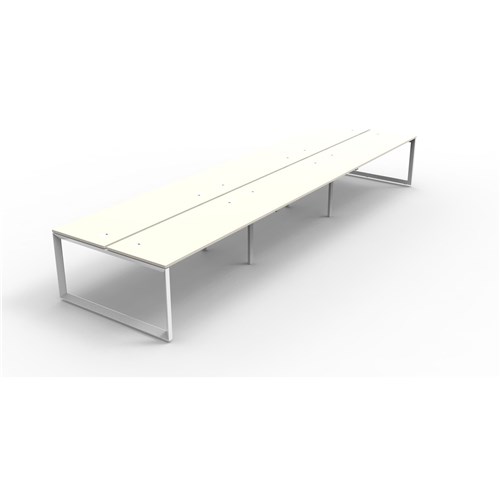 No Screen Natural White Top with Cable Entry Hole 3600mm W x 1430mm D Overall - 1200mm W x 700mm D x 730mm H Per User 60mm x 45mm Bevelled Edge Loop Leg in White P/C 30mm Cable Access Void In Between Double Sided Users Dual Cross Bar For Added Stability E1 Rated Melamine Worksurface Adjustable Levelling Feet 5 Year Manufacturer's Warranty