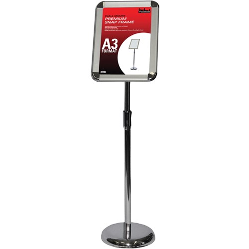 Foyer stand that is perfect for entrances or doorways to promote information or special messages Can be used as portrait or landscape 32mm round corner frame Supplied with adjustable chrome metal pole and base