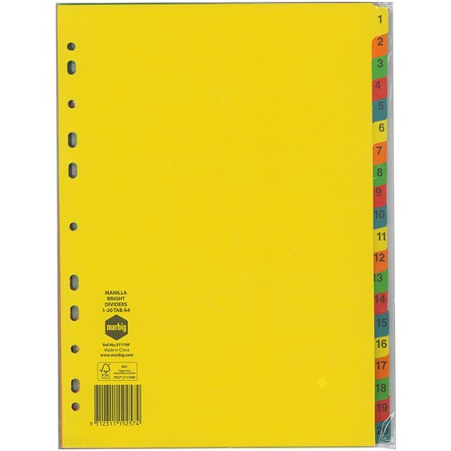 Marbig Manilla Indices & Dividers A4 1-20 Tab Bright Colours