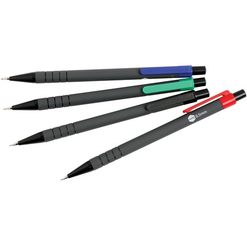 Stylish mechanical pencils with cushioned grip and eraser. Box includes 3 each of black, red, blue and green coloured pocket clips. Takes 0.5mm leads.