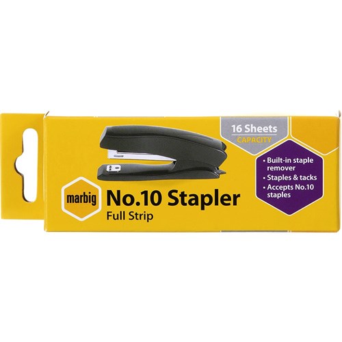 Staples up to 16 sheets of paper (80 gsm). Constructed from a lightweight, reinforced plastic for strength and portability. Rubber feet to protect your desk from scratches. Low staple indicator. Convenient, top loading refill mechanism. For No. 10 Marbig staples.