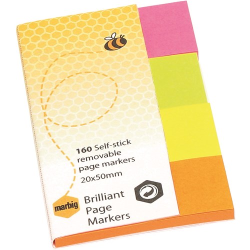 Quality self-stick repositionable page markers that re-stick again and again. Use as bookmarks to mark a spot in documents, reports, etc. Easy to write. Bright colour allows the marker to stand out in your document. Booklet of 160 (4 colours x 40 sheets). Dimensions: 20x50mm.