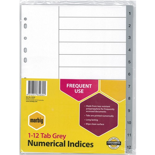 Marbig Plastic Indices & Dividers Tabs A4 1-12 Grey