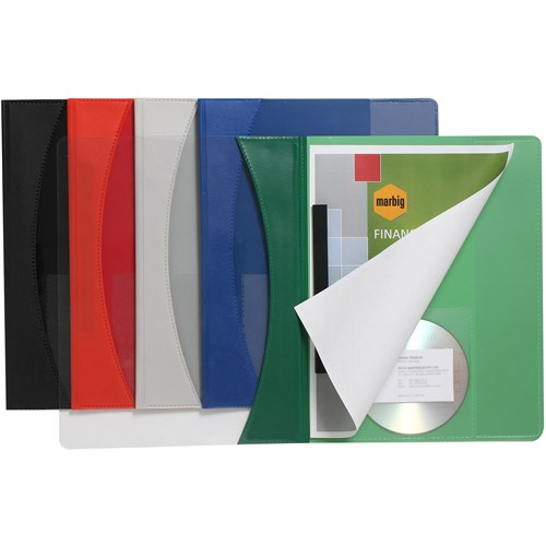 Semi-rigid A4 file with a clear front cover. Inside back cover with vertical pocket, CD holder and business card holder. Features 2 prong fastener to secure documents. Just punch your papers and insert. This allows you to edit your report easily and quickly. Includes a slide bar over the 2 prong fastener to secure contents and enhance appearance.