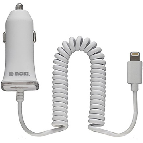 MFi certified - made for iDevices. Gives you the convenience to charge your portable USB devices on the go. Along with MFi Lightning 2.4 Amp fixed cable, there is also the 1.0A USB input port ideal for connecting any other USB-charged device. Suited to most car and truck's auto auxiliary output. Compact coiled cable stretches up to 2m. 2.4A fixed Lightning cable. 1.0A USB port for other devices. 1 Year Manufacturer's Warranty.