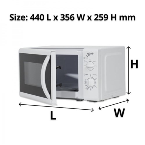Compact conventional 20 litre microwave. 5 power setting dial and countdown timer dial. Pull handle door opening. Power: 700 Watt. Dimensions: 440W x 356D x 259mmH. AUS/NZ Electrical Safety Standards approved. 2 Year Manufacturer's Warranty.