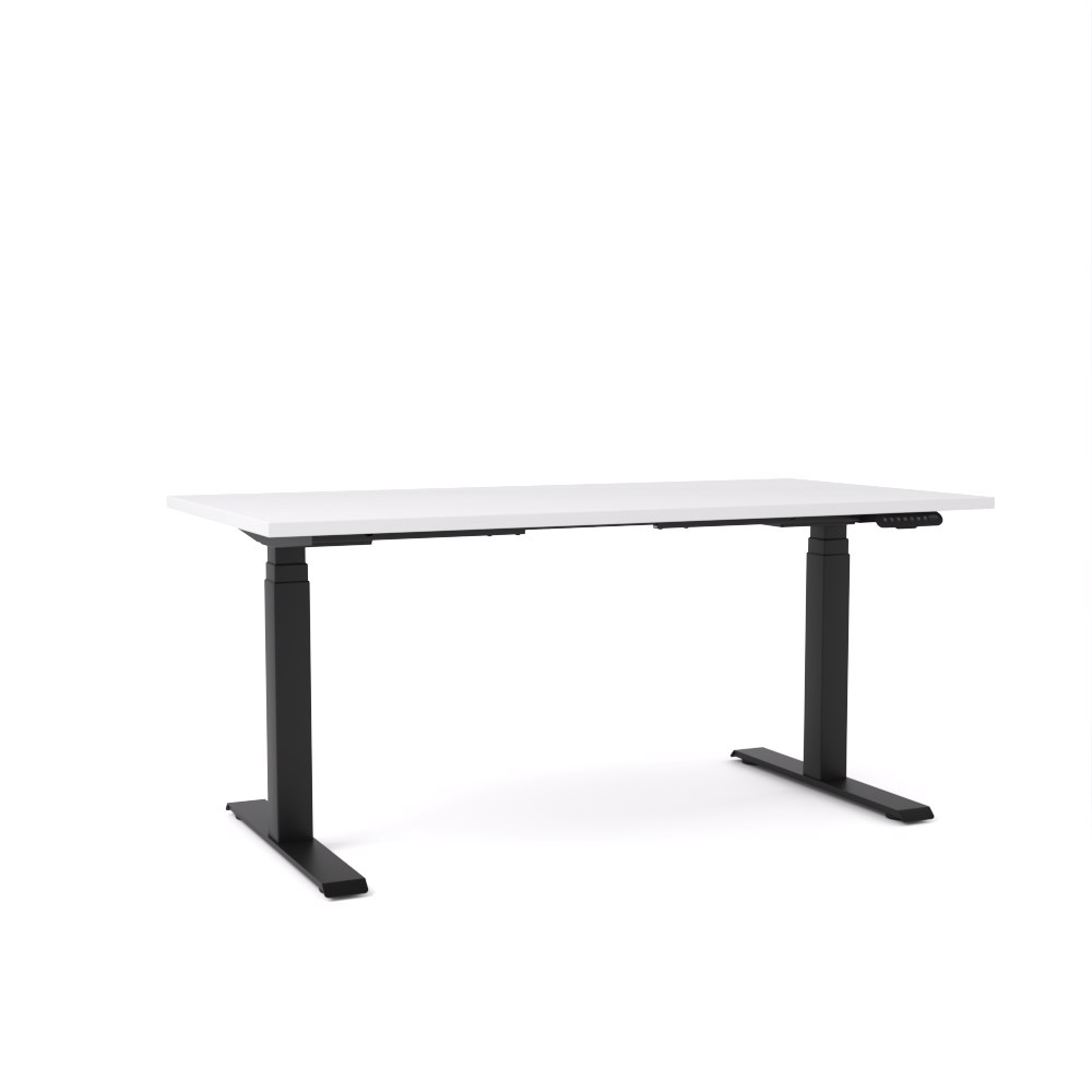 Height adjustable Black frame White top. Dimensions: 1500W x 750D x 685-1130mm (incl worktop). 160 kg weight rating (evenly distributed). 3 stage, 4 point memory control with LCD readout, programmable to restrict min/max height and to set anti-collision sensitivity. 90 x 60mm legs. Flat foot design. Electric Double motor concealed in each leg and only 40db whilst in operation. Commercial grade 25mm worktops finished with matching 2mm PVC edge. 10 Year Manufacturer's Warranty. Delivery, installation and assembly charges may apply to furniture. Please enquire to confirm.